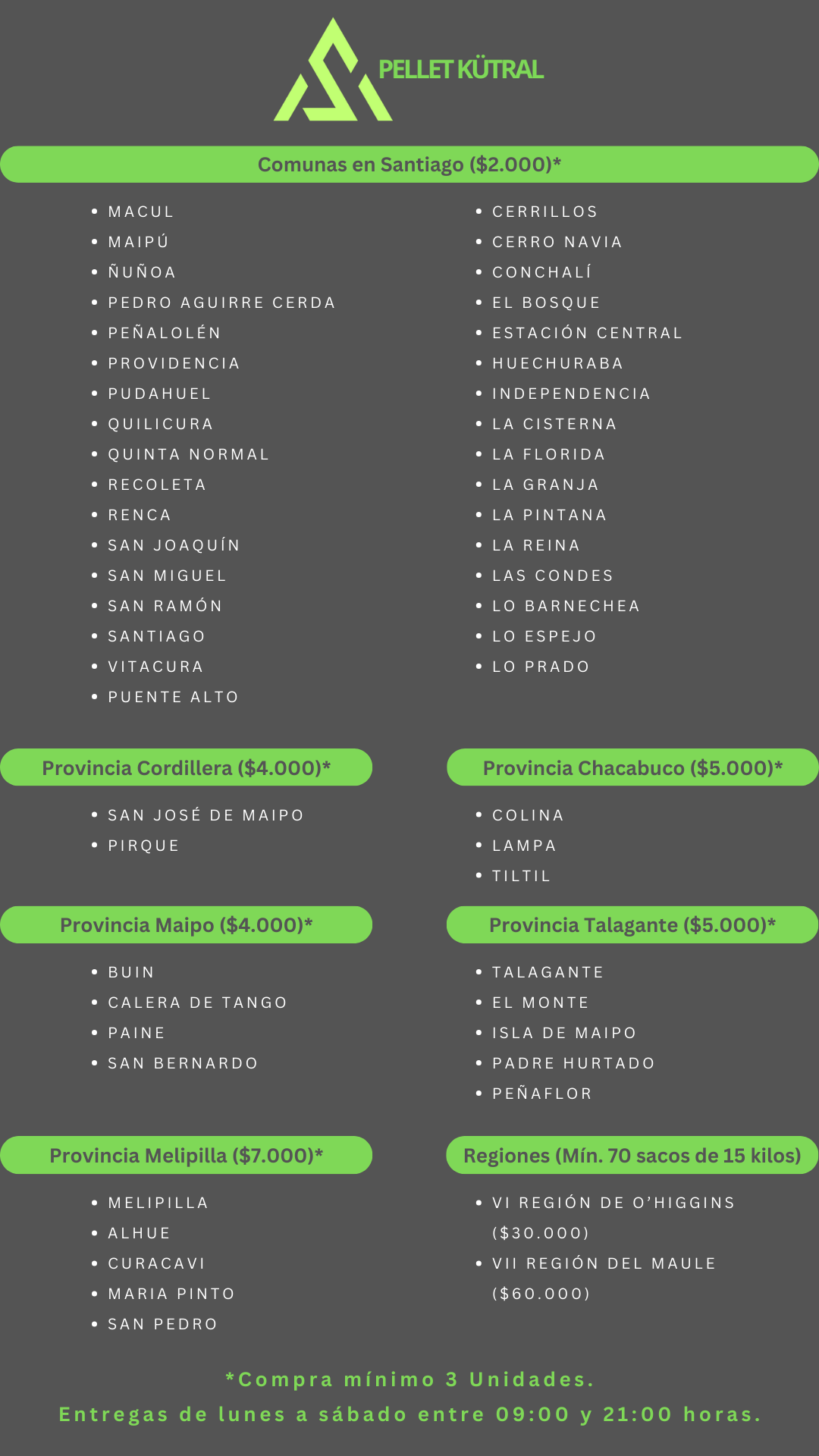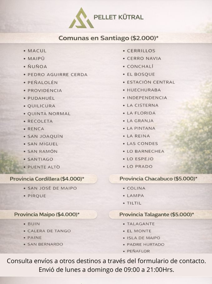 El costo de envío para 33 comunas de la Región Metropolitana es de solo $2.000, facilitando que más hogares puedan acceder a un producto de calidad sin costos excesivos de despacho. En PelletKutral, tu compra llega a tiempo y con la confianza que mereces.